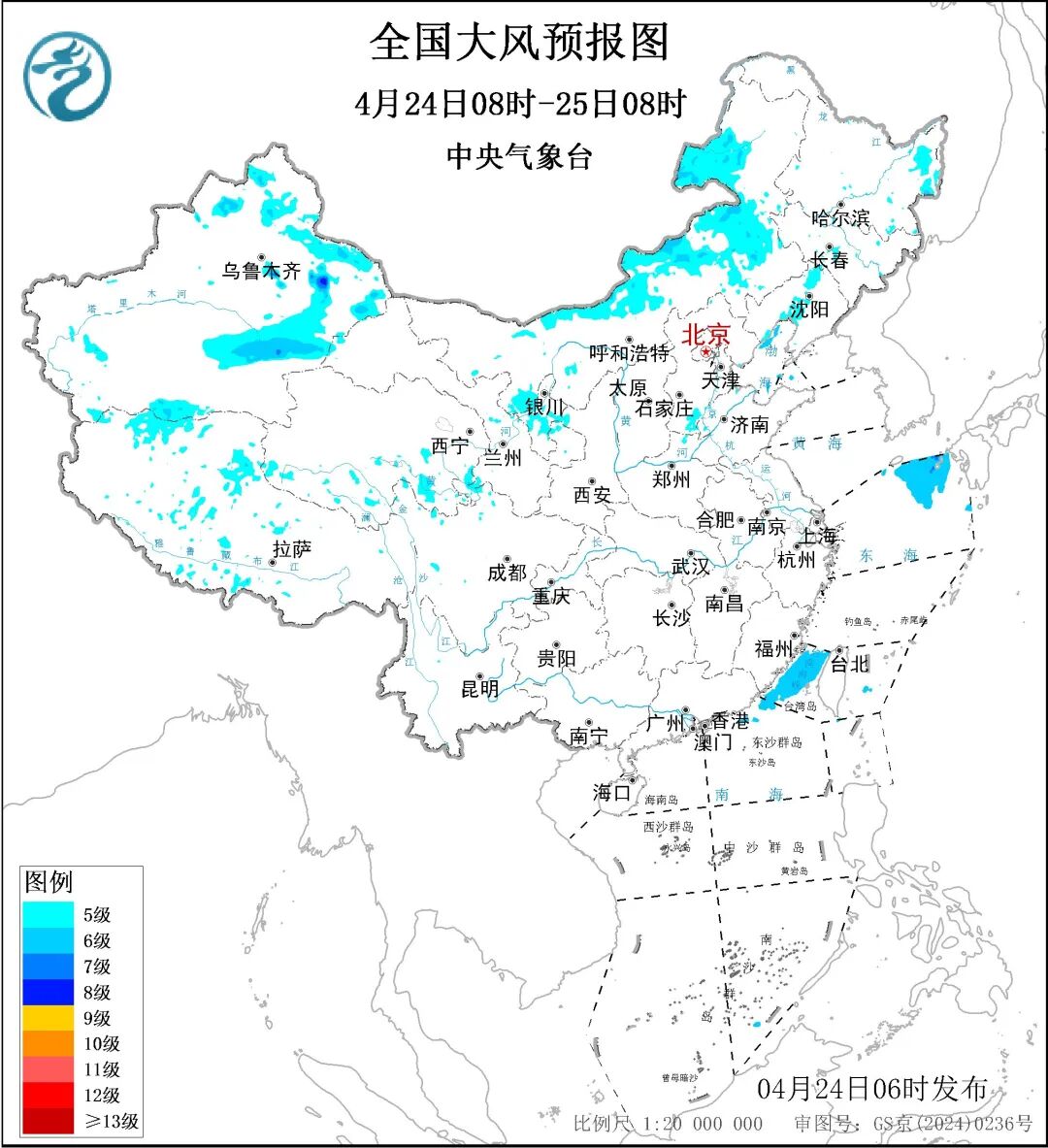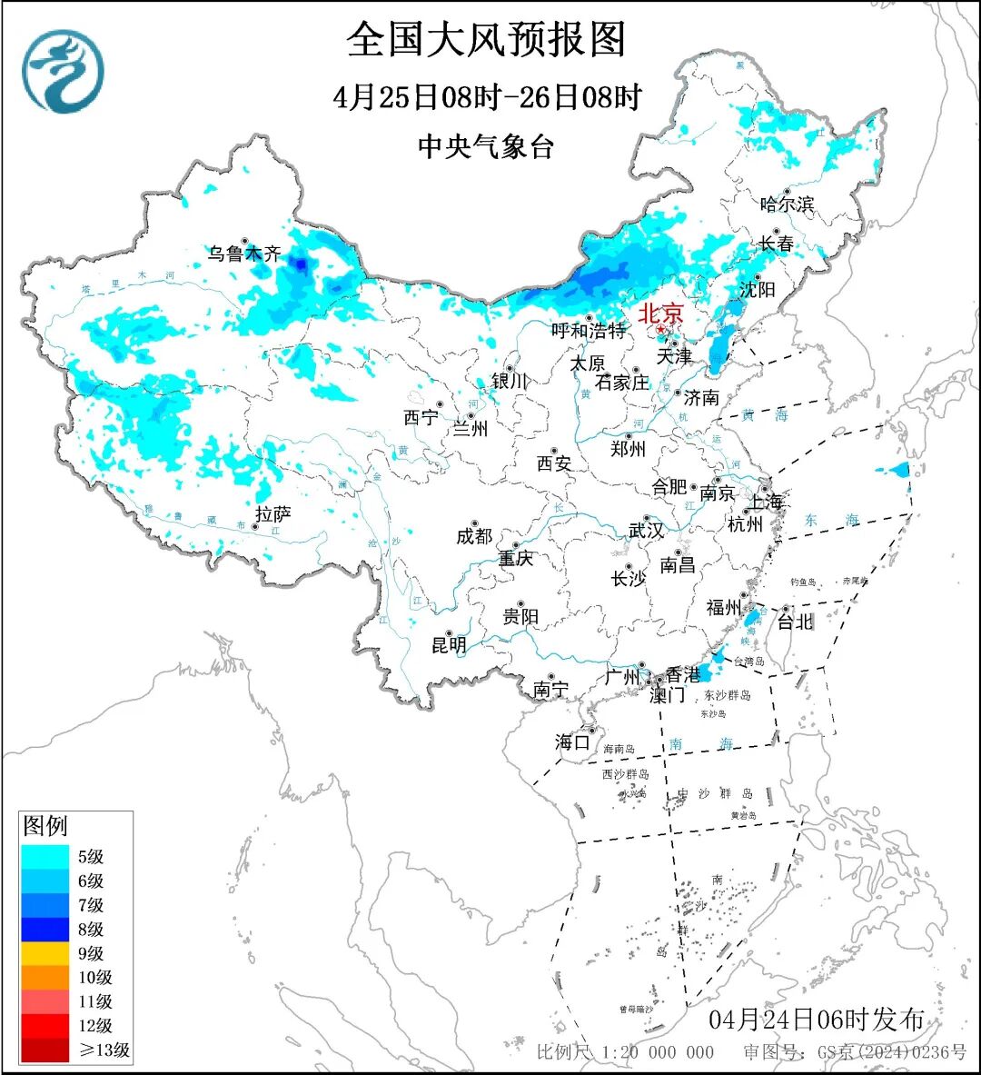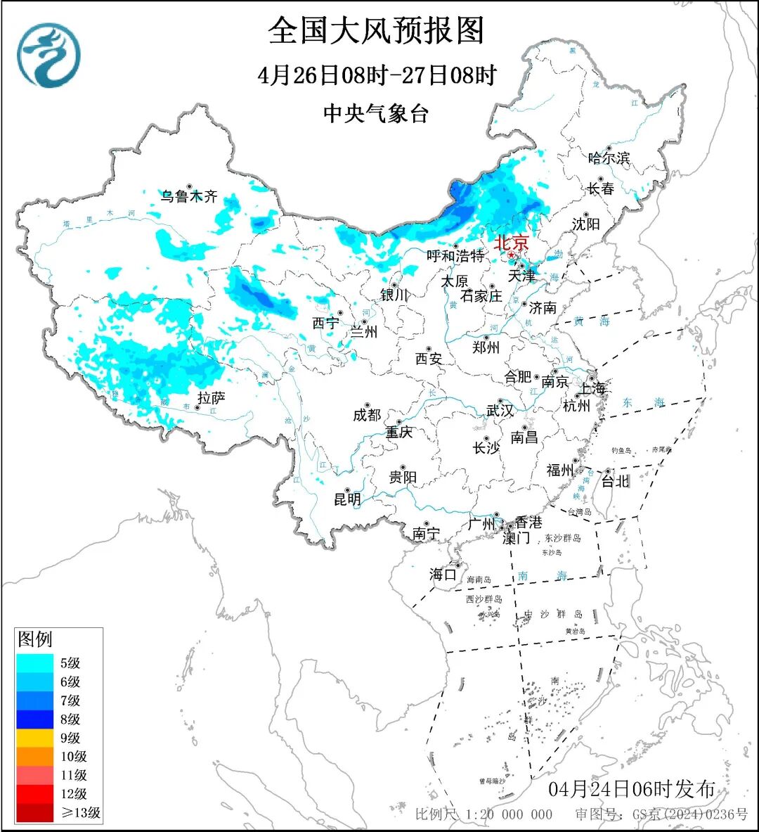 24日至27日,北方地区将多大风天气,新疆东部、西北地区东部、内蒙古、华北、黄淮、东北地区及青藏高原等地部分地区有4至6级风、阵风7至8级。