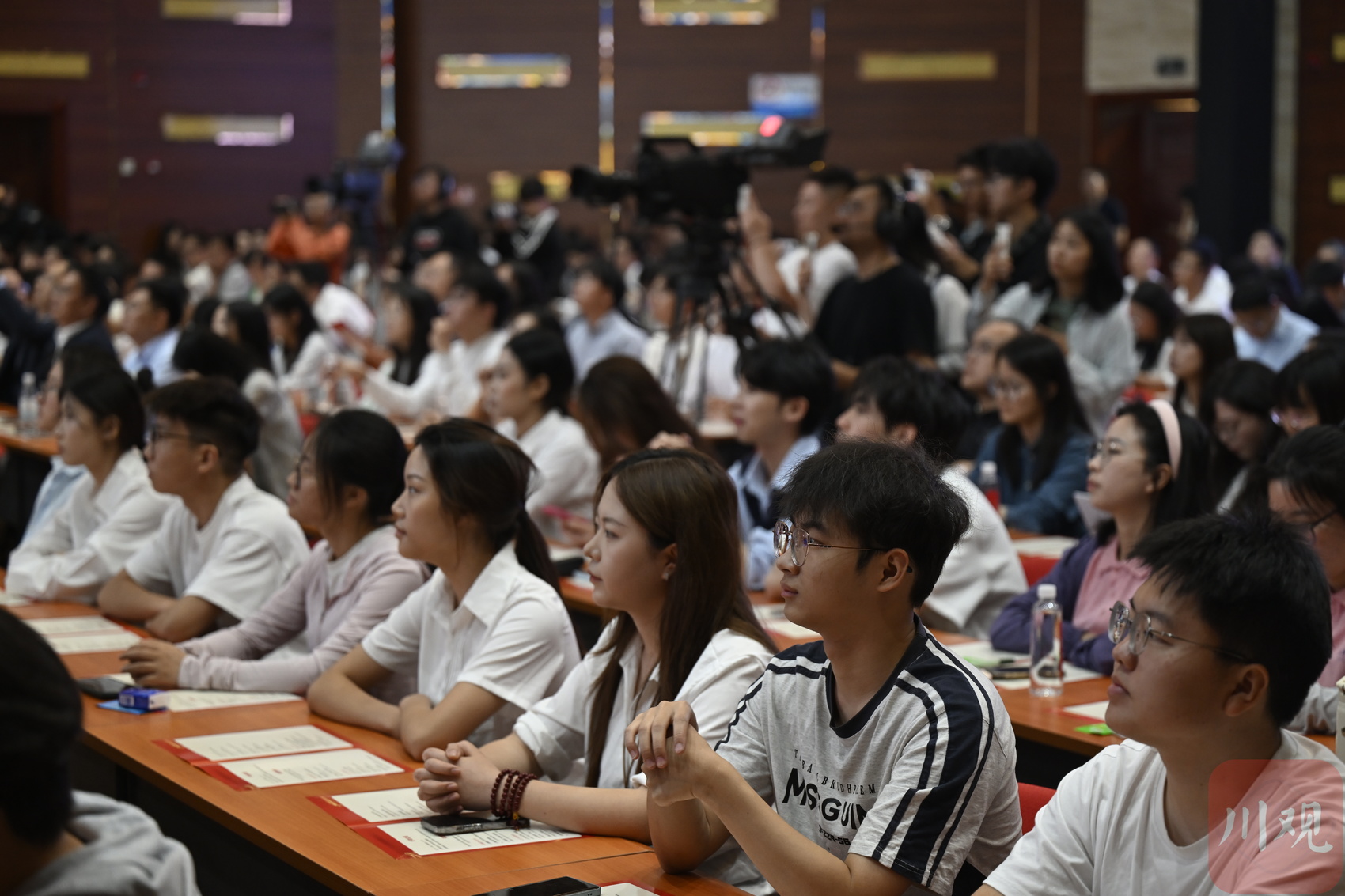 活动现场,以“领袖关怀记心间”为开篇,情景诗歌朗诵艺术再现了蜀道之险、行路之艰的历史困境,又通过人民日报长篇通讯《蜀道新歌》创作团队的讲述,展现了巴蜀儿女牢记嘱托、感恩奋进、推动新时代治蜀兴川的昂扬精神风貌和显著发展成就。分享环节,则以“万千气象看四川”为主题,通过党员干部、基层群众、科研人员、文化学者等的深情讲述,使四川改革发展的新变化新成就呈现在师生眼前,把国家战略、四川实践、青年成长紧密相连;青年榜样代表登台,发出“到祖国和人民最需要的地方去”的青春宣言,凝聚起新时代青年的奋进力量。