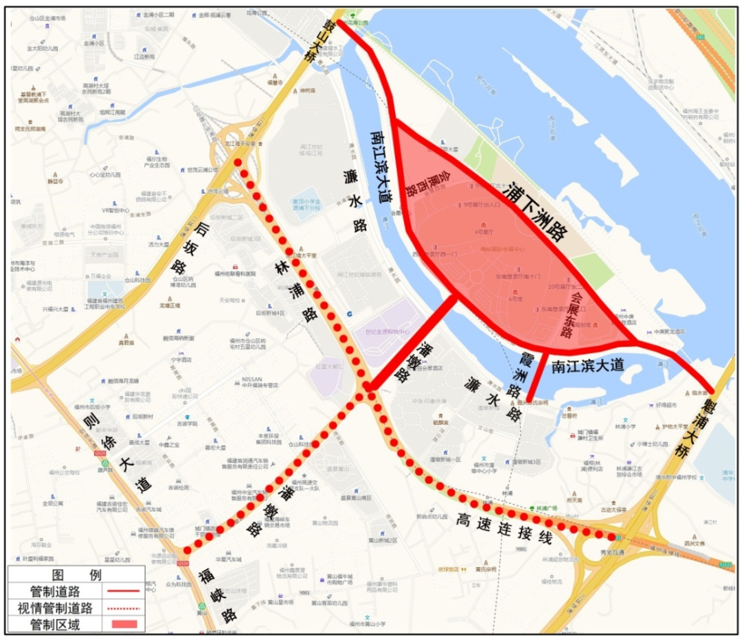 2026年4月29日14:00至18:00和2026年4月30日至5月4日每日7:00至18:00,公安交通管理部门将根据道路交通流量实际情况,视情对浦下洲路、会展东路、会展西路、南江滨大道(魁浦大桥桥下至鼓山大桥桥下)、潘墩路(林浦路路口至南江滨大道路口)、霞洲路(南江滨路口至濂水路口)实行交通管制,禁止机动车(持专用通行证车辆、公交车、出租车以及周边单位、小区车辆除外)通行。