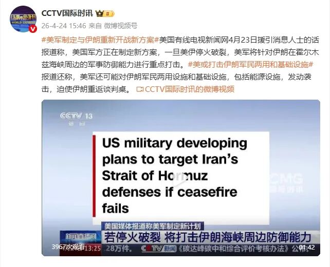 据@CCTV国际时讯报道,美国有线电视新闻网4月23日援引消息人士的话报道称,美国军方正在制定新方案,一旦美伊停火破裂,美军将针对伊朗在霍尔木兹海峡周边的军事防御能力进行重点打击。报道还称,美军还可能对伊朗军民两用设施和基础设施,包括能源设施,发动袭击,迫使伊朗重返谈判桌。