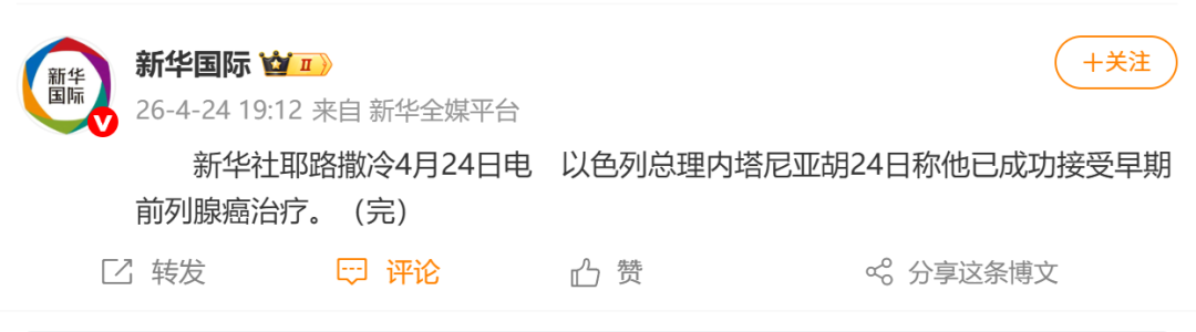 以色列总理内塔尼亚胡24日称他已成功接受早期前列腺癌治疗。