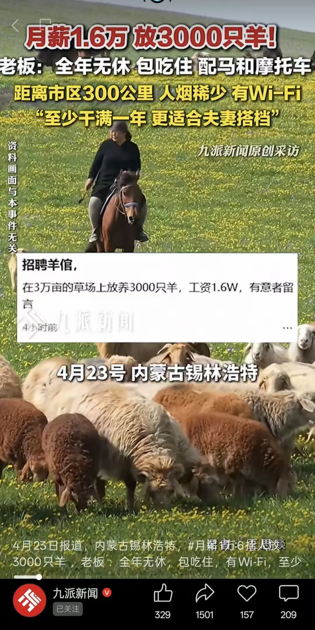 有草原、有成群的羊、有月薪1.6万元的高收入……据媒体4月23日报道,来自内蒙古锡林浩特的一则“牧羊人”招聘信息近日走红网络。