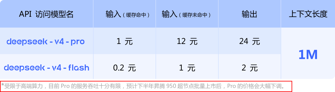 另一边,DeepSeek在披露价格的同时,还在价格栏的小字中明确提到:受限于高端算力,目前DeepSeek-V4-Pro的服务吞吐十分有限,预计下半年昇腾950超节点批量上市后,Pro的价格会大幅下调。