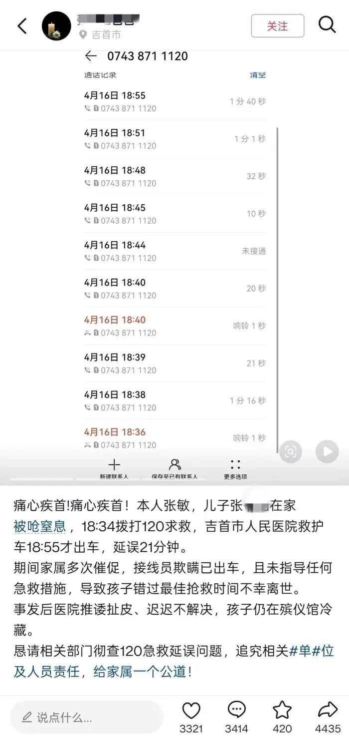 通话记录和监控截图还原了事发经过:18点34分首次拨打120后,张先生在18点36分至55分期间,多次拨打吉首市人民医院座机催促。医院监控则显示,救护车直到18点55分才驶离医院。