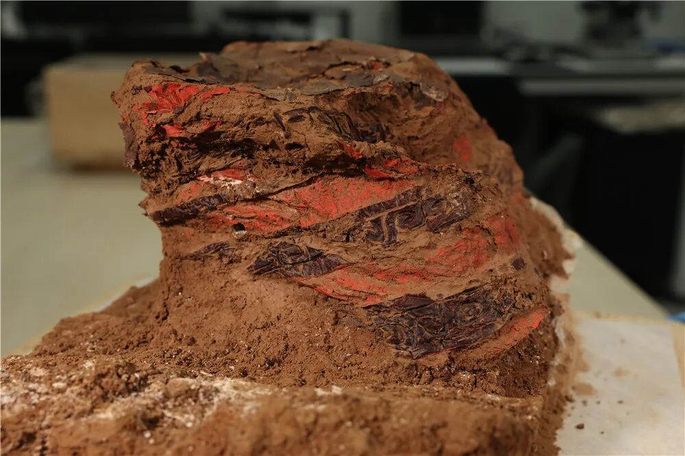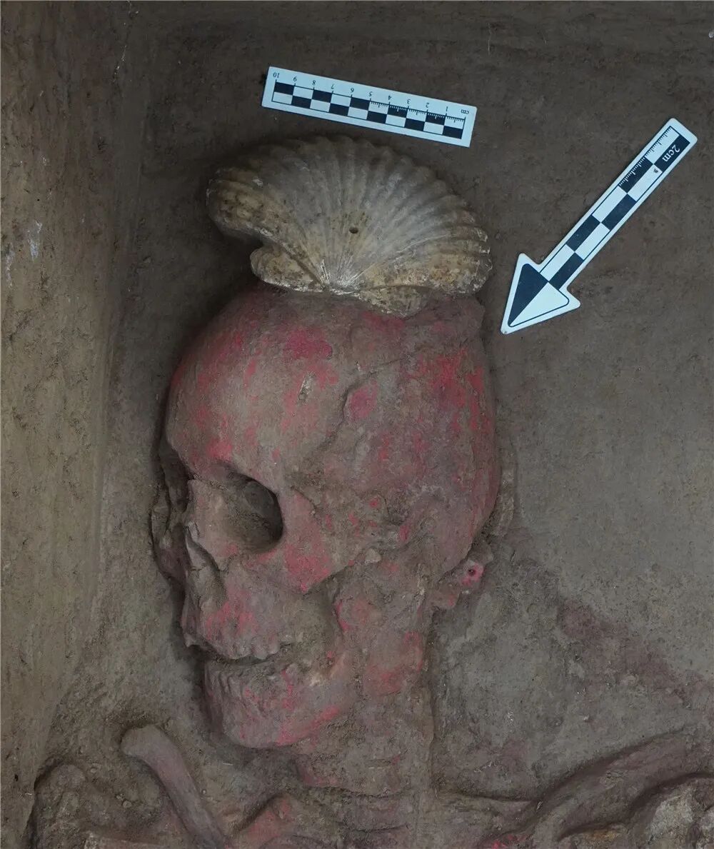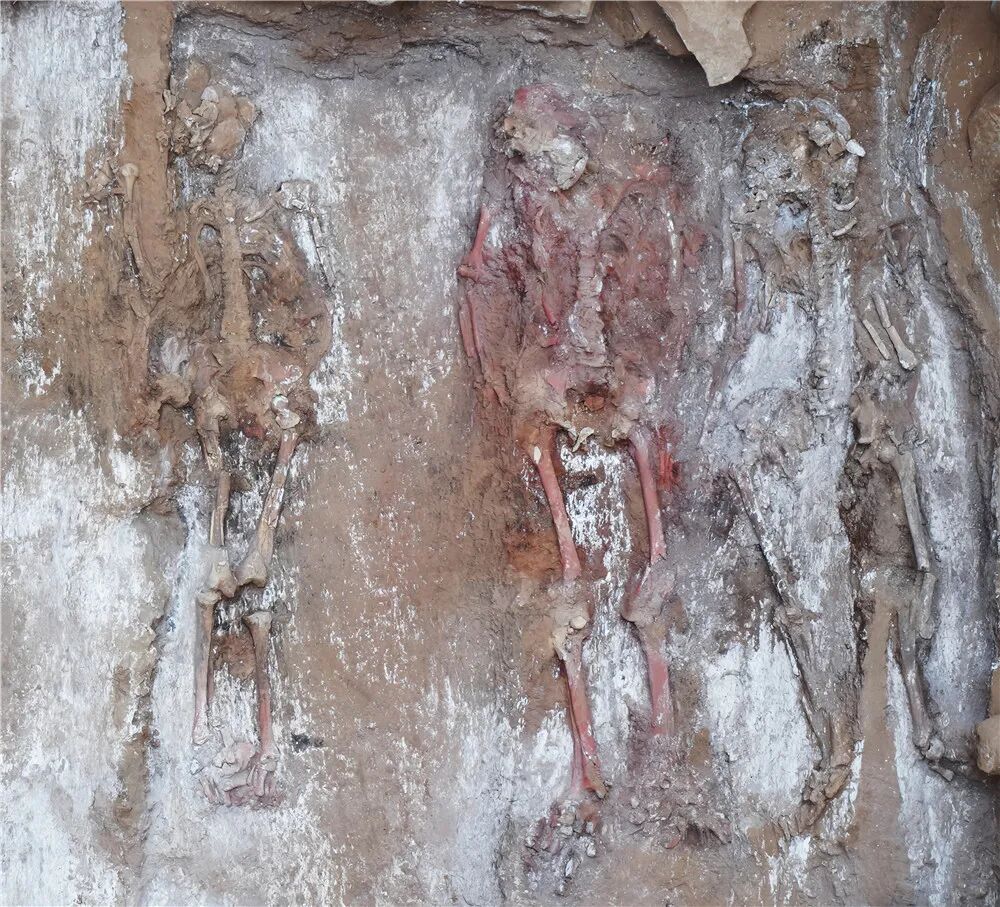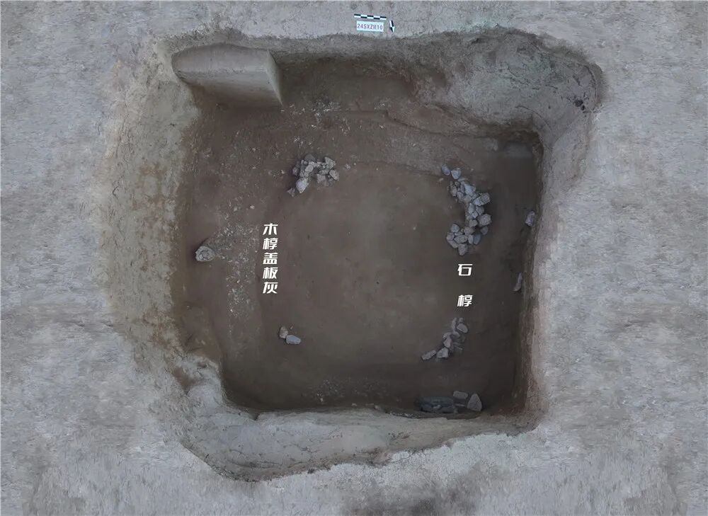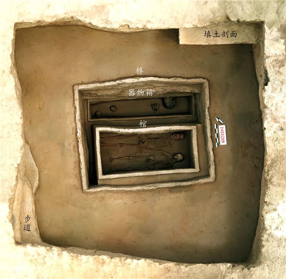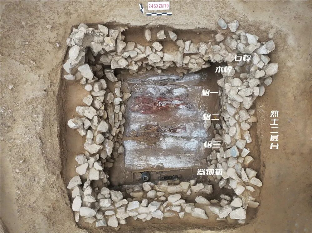 6座夏时期墓葬可分为大、中、小三类。大型墓M10墓口面积约46平方米,熟土二层台,两椁,外椁为石椁,内椁为木椁,椁内并列三棺。中间墓主为一56岁以上的男性,头顶扇贝饰,身体满涂朱砂,右腿随葬绿松石牌饰。两侧女性墓主年龄约25岁,身体局部涂朱。墓室北部的器物箱放置陶爵、斝、大罐、小罐、漆器,墓室北壁壁龛内有一男性殉人。
