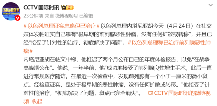 另据CCTV国际时讯,以色列总理内塔尼亚胡4月24日在社交媒体发帖证实自己患有“极早期的前列腺恶性肿瘤,没有任何扩散或转移”,并且已经“接受了针对性的治疗,彻底解决了问题”。