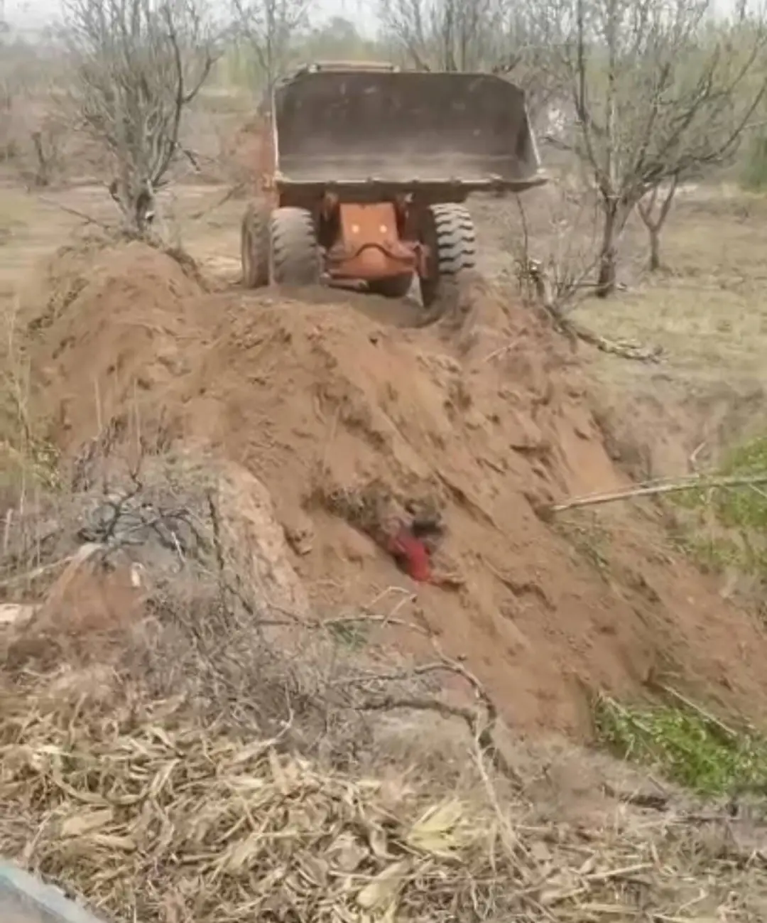 网传视频显示,在一处正在推土的土堆中,伴随着铲车的轰鸣声,一名红衣村民被土掩埋,仅露出头部和肩膀。多名身穿公安制服的工作人员在一旁,其中有人手持记录仪。视频拍摄者称,“派出所的人来了,(任某某)照样把人掩埋了。”