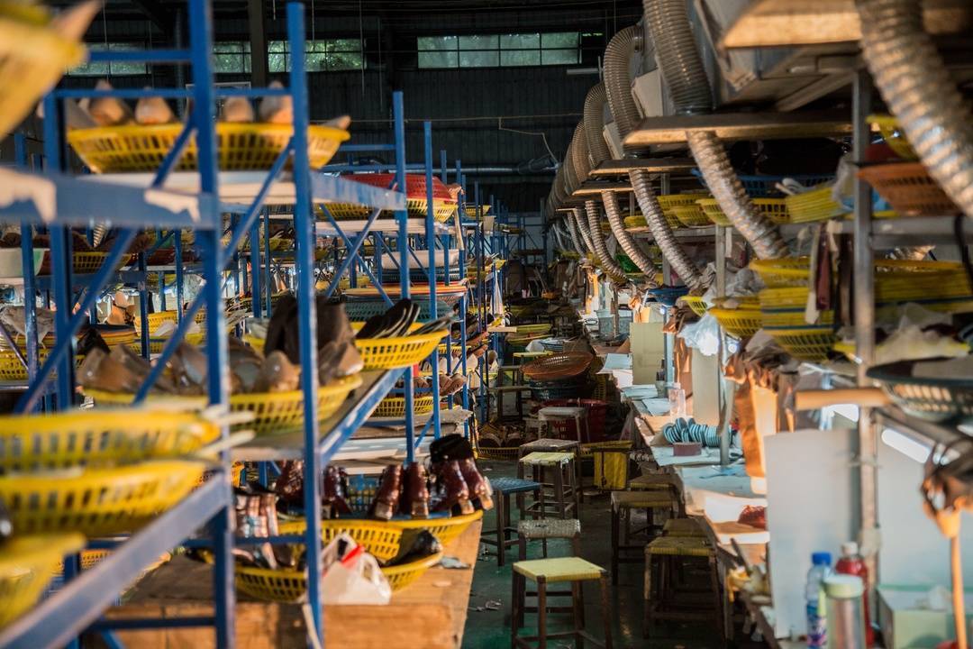 “阿么手工女鞋”公司内部长廊整齐摆放着各类款式女鞋