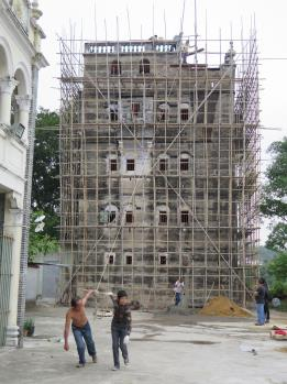 研学活动的组织者邓华是一位年过六旬的越南归侨。邓华2011年来到开平塘口镇仓东村。苍东村是典型的华侨村落,有着数十栋岭南风格的民居、祠堂和碉楼,但彼时已破败凋零,只留下6户人家、20名老人和小孩。邓华自掏腰包200多万元,对村里50多间房屋逐一研究,随后带领义工和村民开始修复。