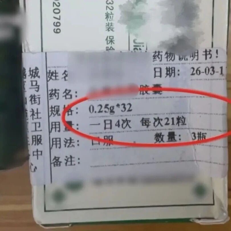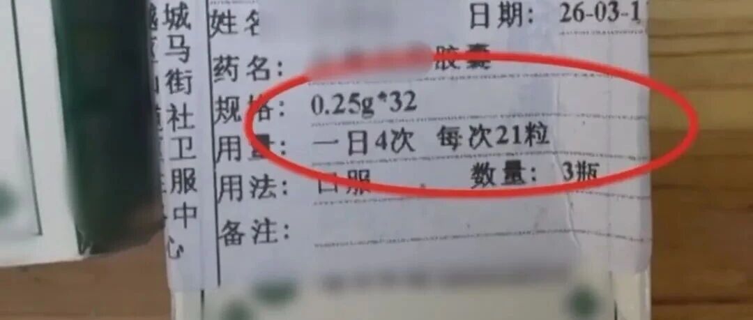 此前,据媒体报道,浙江绍兴一位大妈因脚部受伤,到越城区马山街道社区卫生服务中心就医,结果院方开错了一种口服药的剂量,一次2粒变成了一次21粒,大妈遵医嘱在一天内服用了42粒胶囊。