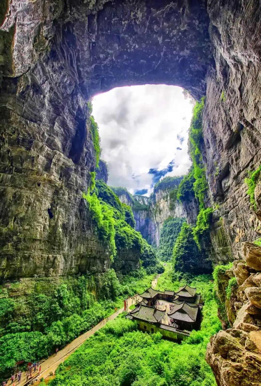 武隆天生三桥:这是地球用几亿年凿出来的“巨型石门”,是 《变形金刚4》 和 《满城尽带黄金甲》 的外景地。️ 天龙桥、青龙桥、黑龙桥,每一座都高过百米,最宽的一座下面能并排走两列火车。站在桥底抬头看,崖壁像被巨人劈开,天空只剩一条缝。