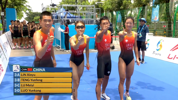 在25日进行的第六届亚洲沙滩运动会游跑两项4x混合接力决赛中,中国队林鑫瑜、滕云峰、陆美伊、罗云康4名队员以领先第二名51秒的成绩获得金牌,中国香港队获得银牌。