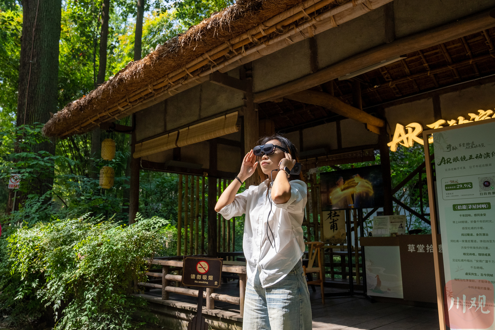 游客于茅屋故居前佩戴AR眼镜,切身体验杜甫携家入蜀、草堂生活等历史场景。