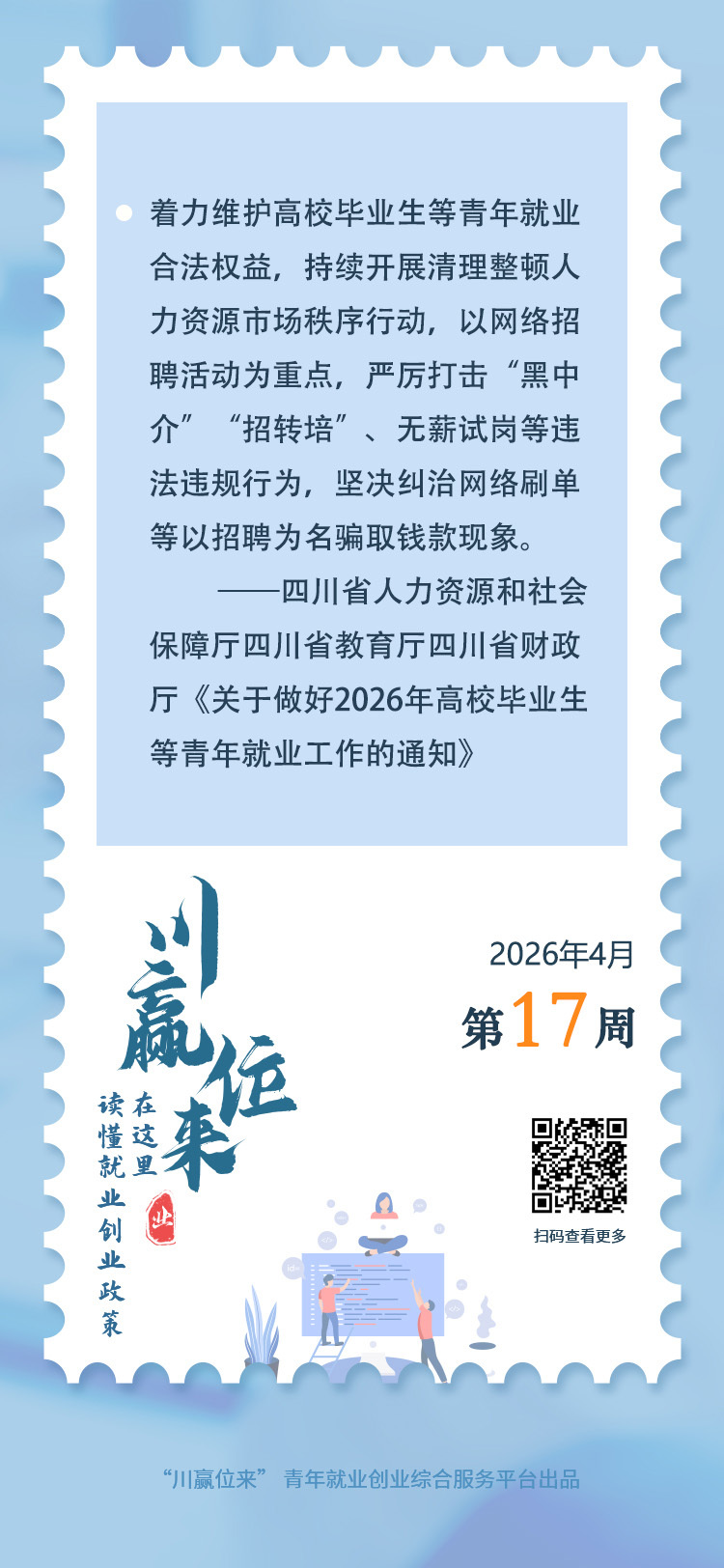 四川将通过严厉打击“黑中介”“招转培”、无薪试岗等违法违规行为,着力维护高校毕业生等青年就业合法权益。近日,四川省人力资源和社会保障厅、四川省教育厅、四川省财政厅三部门联合发文,从岗位挖掘、能力提升等多方面提出18条措施,要求全力以赴做好2026年高校毕业生等青年就业工作。