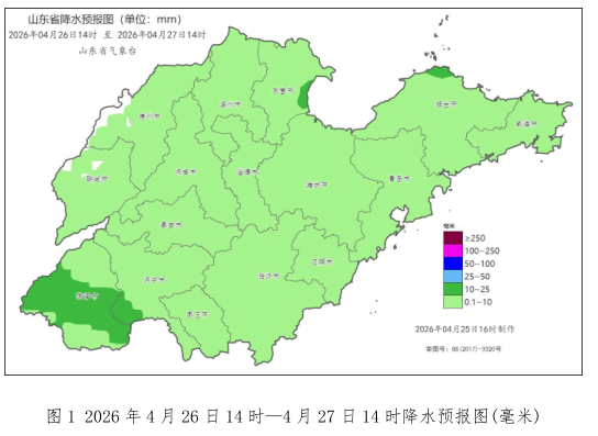 受高空槽影响,预计26日下午到27日上午,山东省自西向东将出现一次强对流天气过程,并伴有雷电和7~9级局部10级以上的雷雨阵风。雨量分布不均,全省大部地区有小雨,鲁南的部分地区有中雨,累积平均降水量2~4毫米,局部降水量可达20毫米以上。