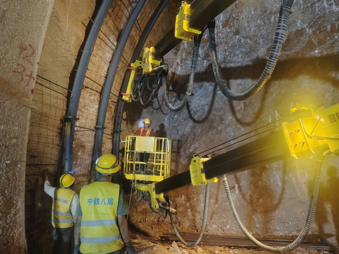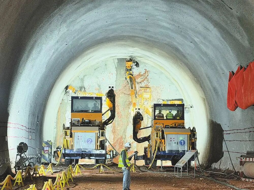 在初期支护中,成套机械的协同优势更加凸显,钢拱架安装机采用遥控操作,同步提升施工精度和效率,降低了安全风险。混凝土湿喷作业采用混凝土湿喷台车双机协同施工,每循环用时3小时以内,提升了施工效率和质量。