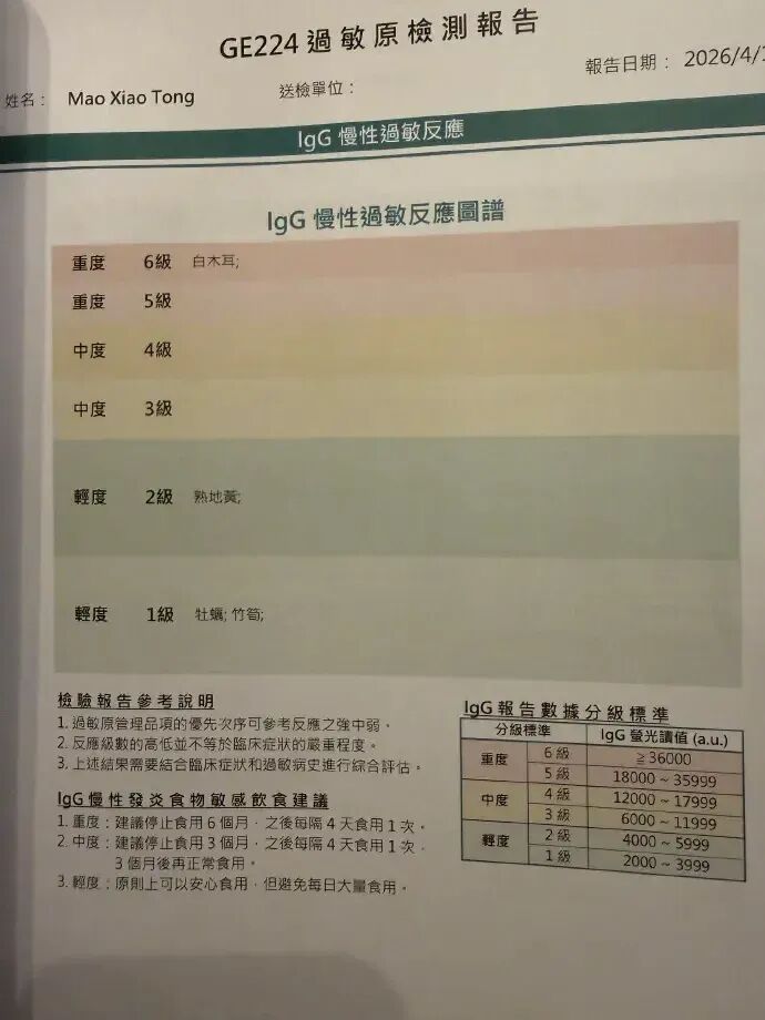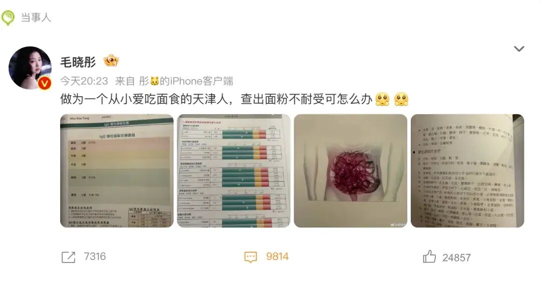 4月24日晚,@毛晓彤发微博回应:“作为一个从小爱吃面食的天津人,查出面粉不耐受可怎么办。”她还晒出了过敏原检测报告。