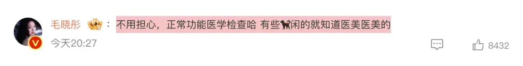 随后她还在评论区表示:不用担心,正常功能医学检查哈,有些闲的就知道医美医美的。