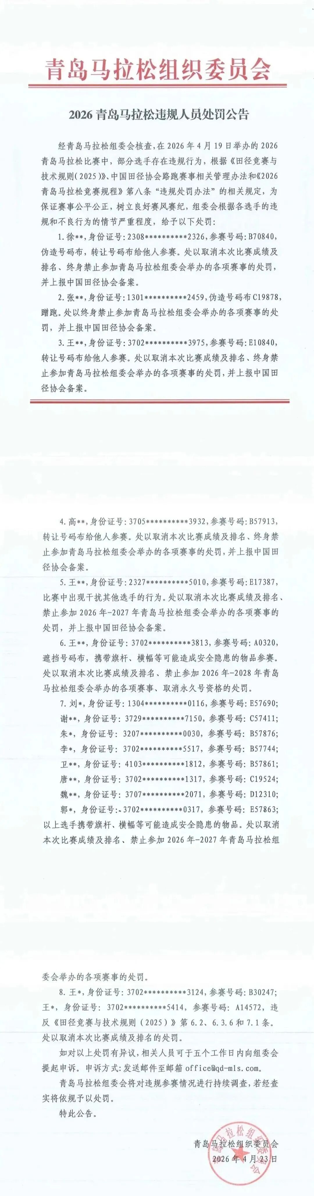 这份官方处罚公告显示,本次青岛马拉松存在替跑蹭跑、私自转让出售号码布、伪造参赛证件、遮挡号码布、赛道携带旗杆道具、奔跑中干扰其他选手等多种违规违纪问题,其中4名存在转让、伪造号码布的选手,直接被处以终身禁赛,并上报中国田协备案。