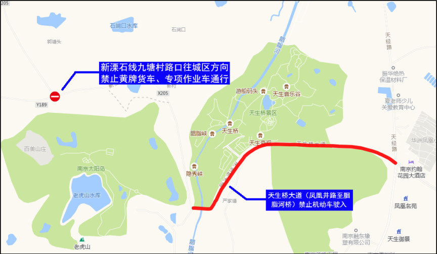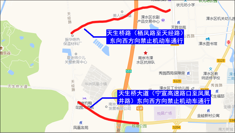 1. 2026年5月1日至2日,每日10时至23时,天生桥大道(凤凰井路至胭脂河桥)双向禁止机动车通行(接驳客车、公交车、摩托车及持通行证车辆除外)。新溧石线九塘村路口往城区方向禁止黄牌货车、专项作业车通行,途经车辆可经老溧石线绕行。