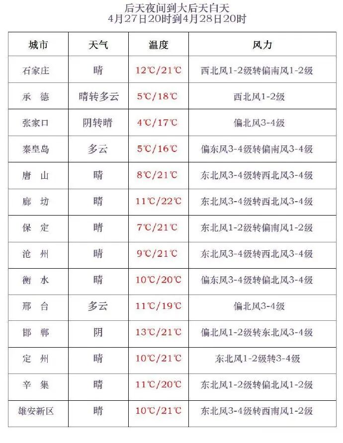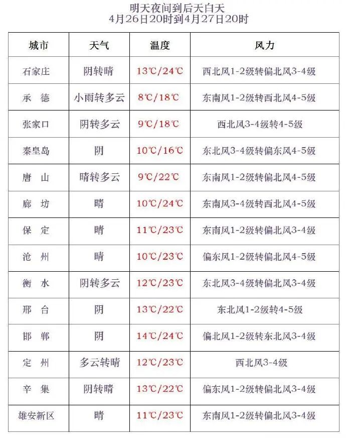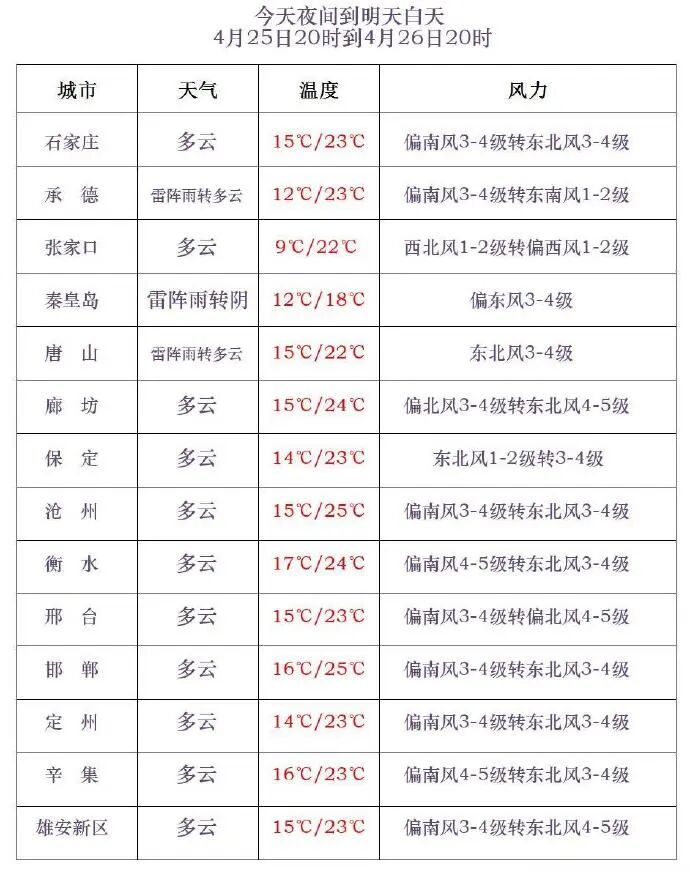 河北省气象台2026年4月25日17时发布天气预报: