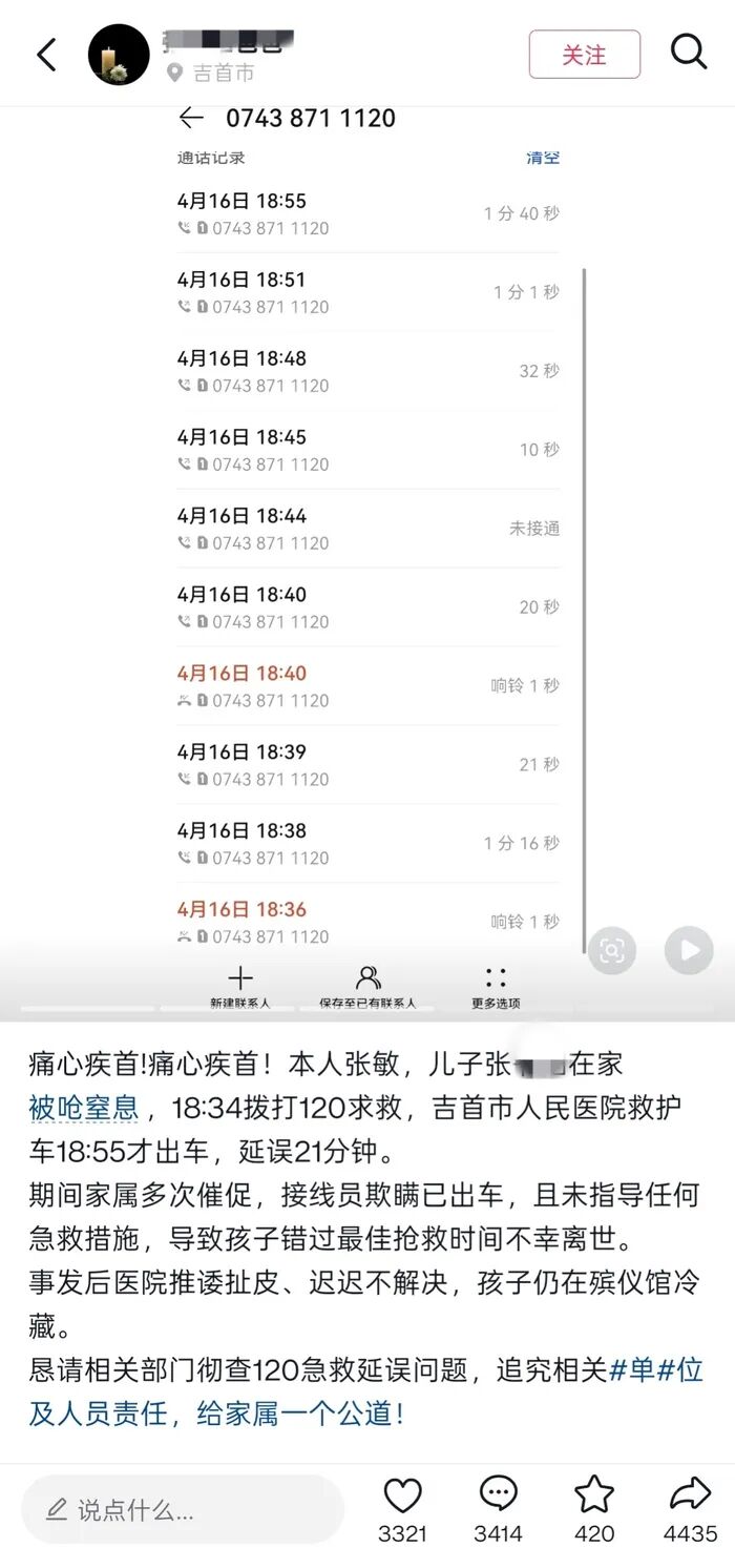 4月18日,湖南吉首一网友发布视频称,16日,其一岁的幼子被呛窒息,其在18时34分拨打120,但吉首市人民医院18时55分才出车,延误21分钟,其间接线员多次谎称已出车,且未指导任何急救措施,最终孩子错过最佳抢救时机,不幸去世,目前院方仍未给出答复。