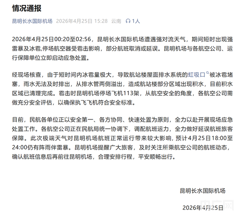 2026年4月25日00:20至02:56,昆明长水国际机场遭遇强对流天气,期间短时出现强雷暴及冰雹,停场航空器受雹击影响,部分航班取消或延误。昆明机场与各航空公司、运行保障单位立即启动应急处置。