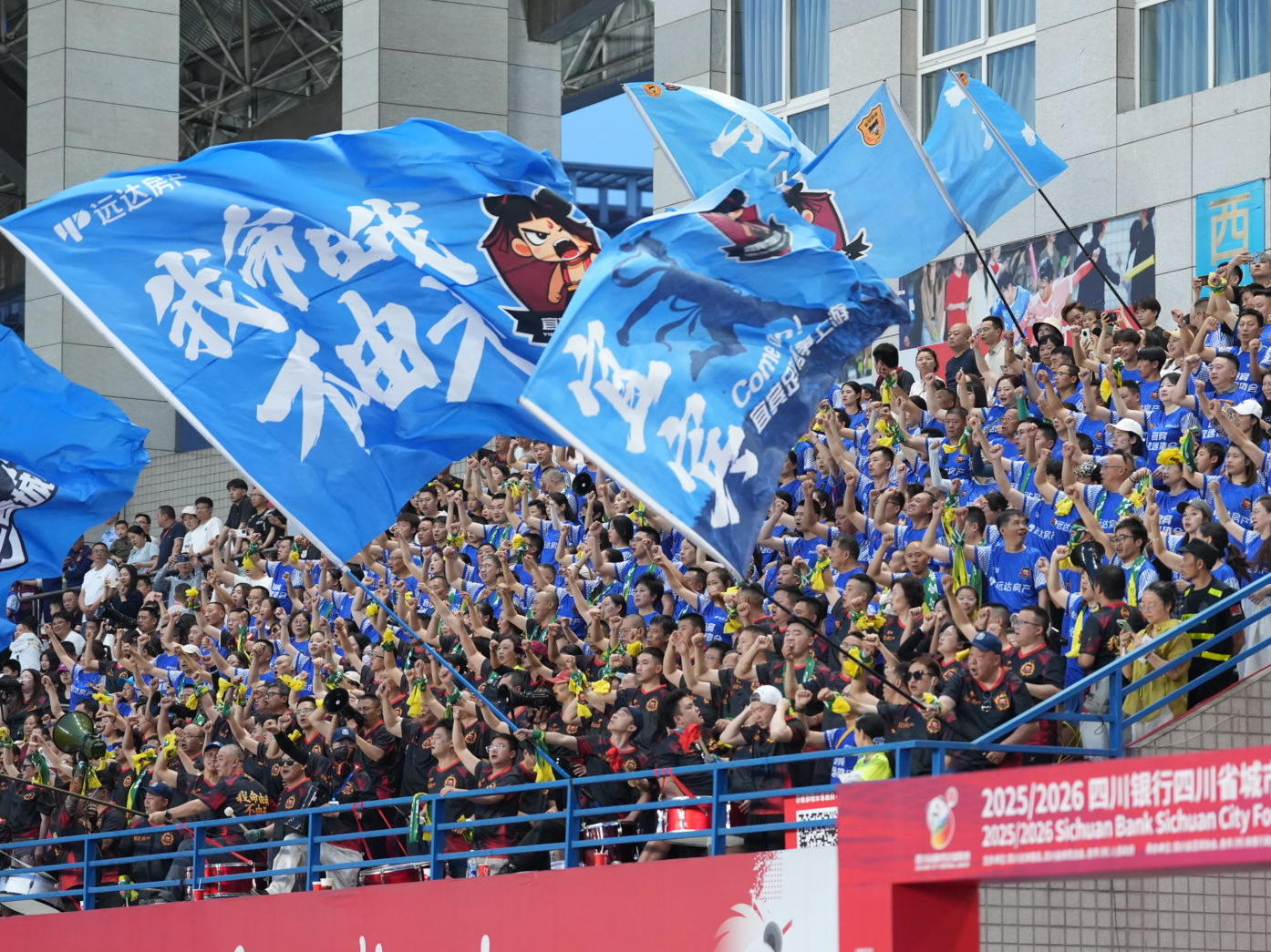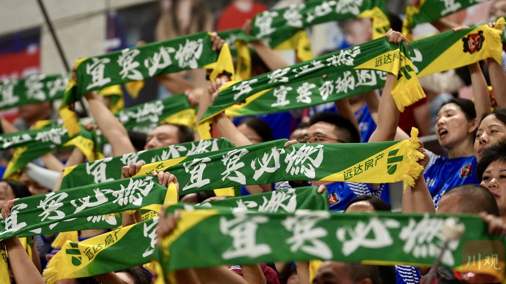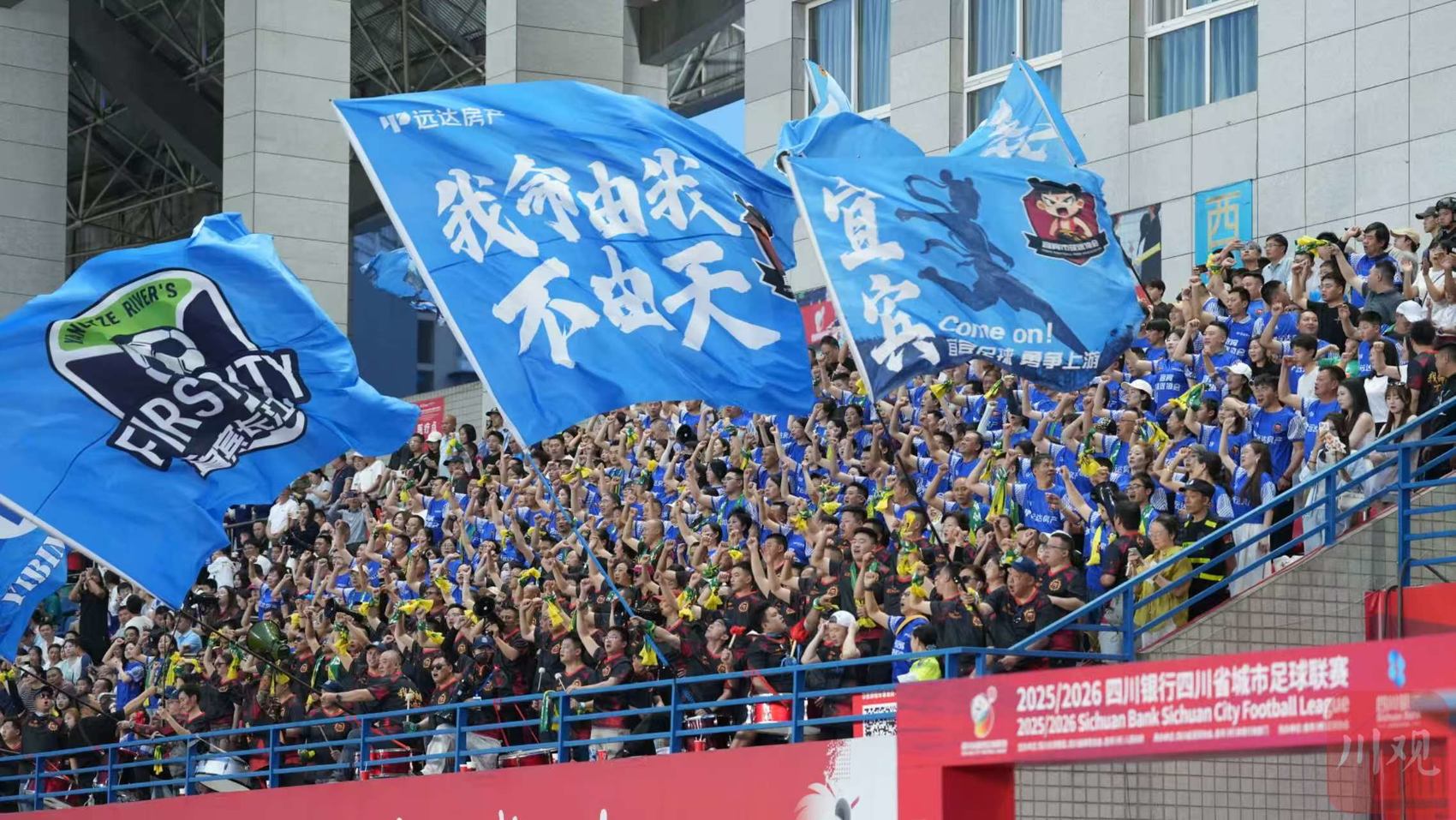 除了场上球员的拼搏,看台上“第12人”的助威声也成为一道动人风景。当晚,近6000名观众涌入南岸体育中心。“进一个”“宜宾雄起”“绵阳雄起”的呐喊声此起彼伏,看台上写有“戎州”“西南半壁”的蓝色旗帜高高挥舞,鼓手擂响战鼓,歌声、哨声、鼓声久久回荡在宜宾的夜空。