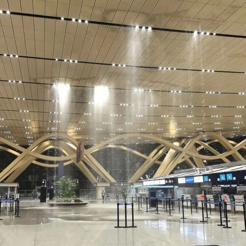 画面显示,昆明长水机场航站楼内部,天花板多处有水流往地面流。