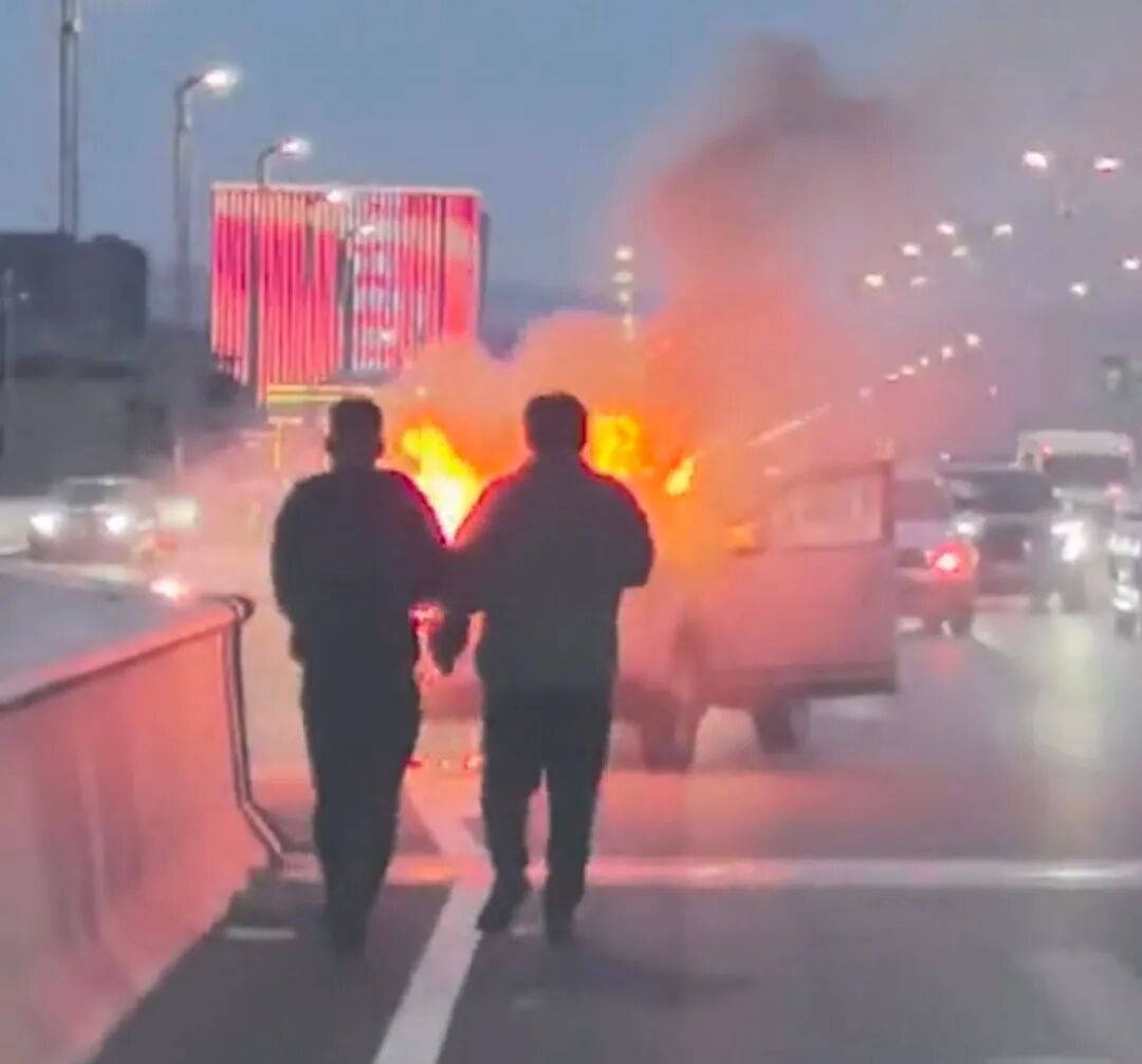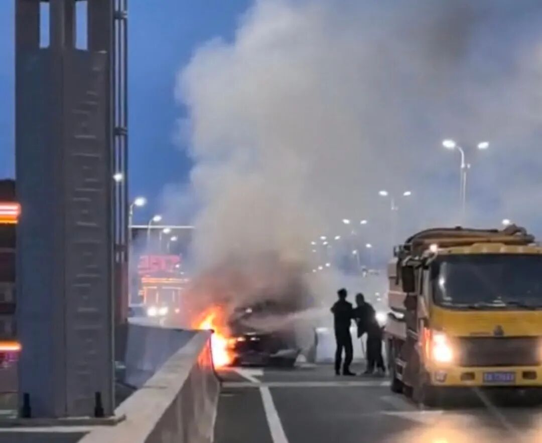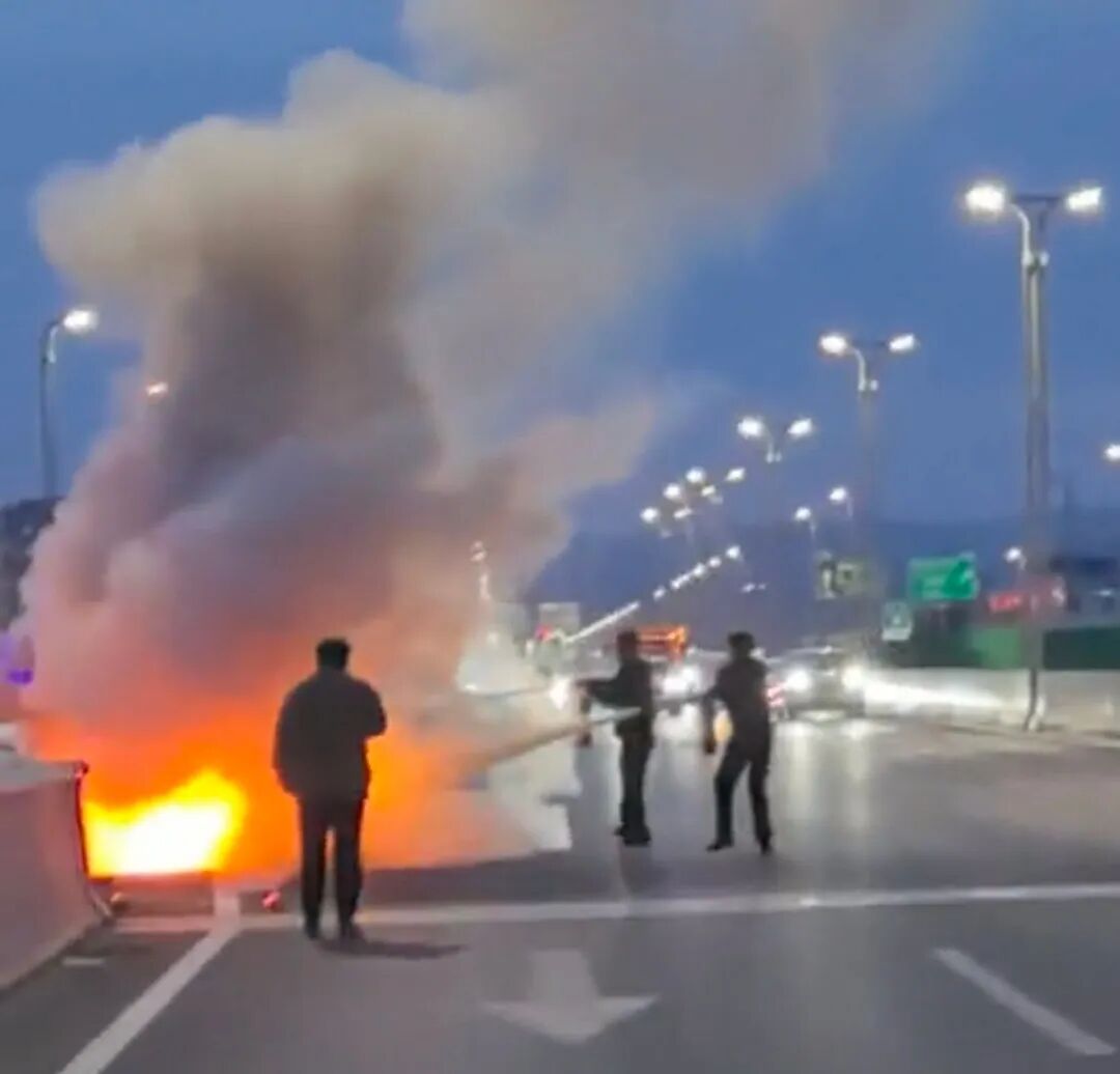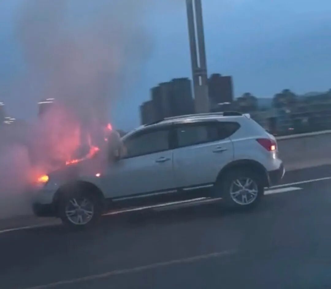 突然,一团火光在桥面上炸开——一辆行驶中的汽车引擎盖冒出浓烟,紧接着有火苗蹿了出来。短短数秒,凶猛的火舌便冲破引擎盖,迅速蔓延至驾驶室。火光在夜色中格外刺眼,车辆燃烧发出的“噼啪”声与玻璃炸裂的脆响交织在一起,周边车辆瞬间陷入慌乱。