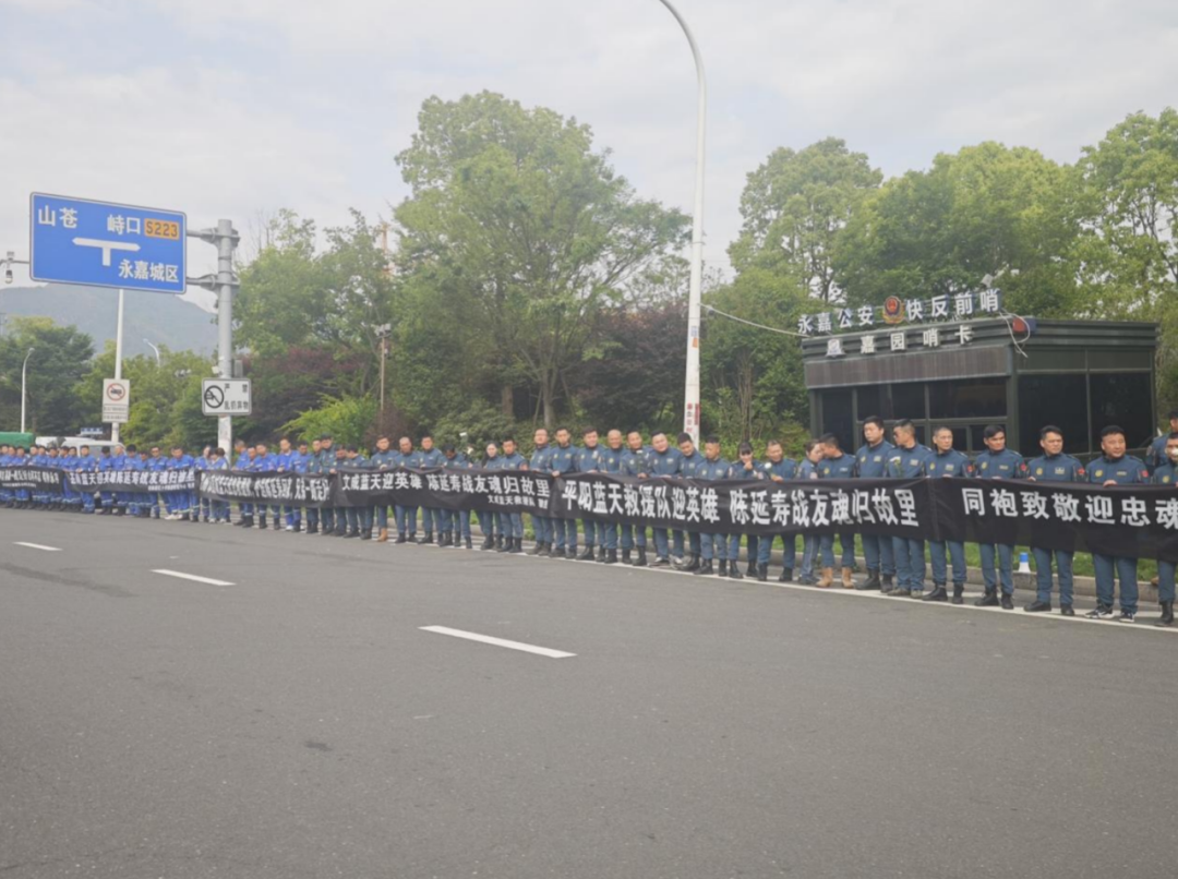 早上8点不到,浙江省永嘉县峙口高速口外,已经站满了人。数十位来自浙江省温州市多支蓝天救援队的队员,或手拿小白花,或手拉着横幅,排成一条长龙安安静静地等着。