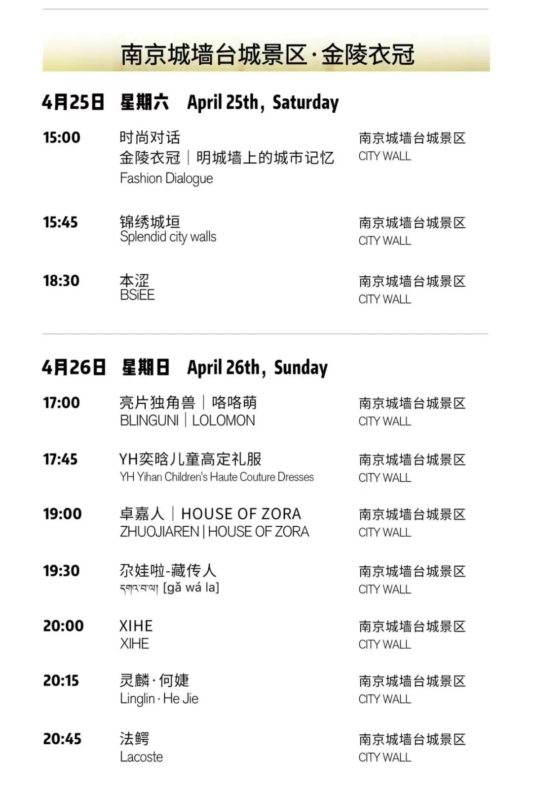 4月26日为集中品牌发布日,来自各地的优质服饰品牌与国际时尚品牌轮番登台,呈现风格多元、层次丰富的时尚大秀。亮片独角兽|lolomon、YH奕晗、尕娃啦、灵麟·何婕等多个童装设计师品牌相继亮相,HOUSE OF ZORA、XIHE等女装高定品牌也精彩登场。国际运动时尚品牌Lacoste压轴登场,以国际化视野为城墙秀场注入现代潮流活力,实现多元时尚风格在城垣之上的精彩对话。