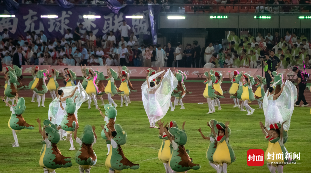 春启巴蜀,风拂盐都——展演在《染春・小马踏歌》中拉开序幕,啦啦操与非遗扎染方阵登场,活力跳跃与飘带翻飞相呼应,演绎丙午赤马一往无前之姿,尽显青少年蓬勃生长之貌;一针一线藏匠心,一染一浸传温情——《盐韵扎染》以灵动之姿铺展非遗长卷,蜀光绿盛332名学子化身为流动的色彩信使,以肢体语言讲述扎染非遗传承故事。学子们演绎从素白坯布到绚烂华章的蜕变。一个“染”字,将自贡盐都匠心与千年扎染文脉凝于川超舞台;压轴出场的是《盐绸共舞 绿茵争锋》,由富顺二中600名学子演绎,串联起千年盐都底蕴与千年绸都文化,致敬双城文化根脉,寓意两地团结共进。