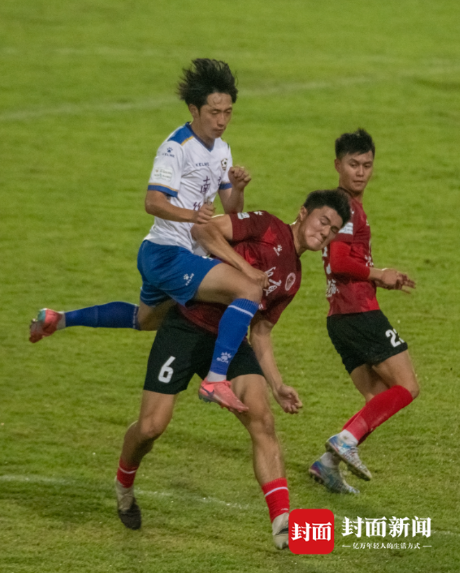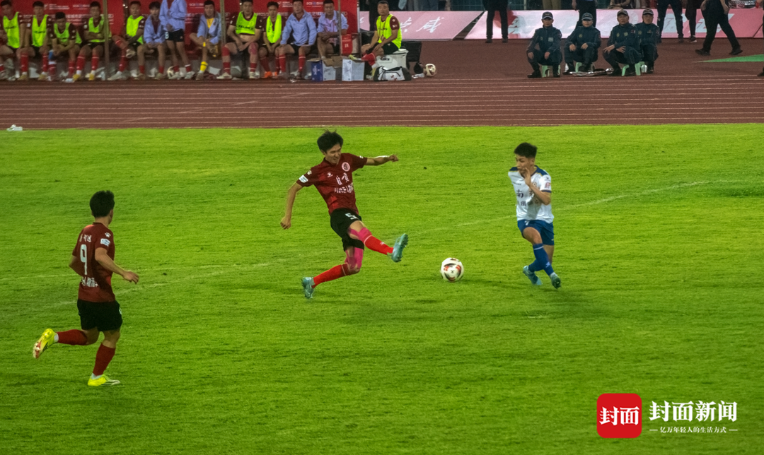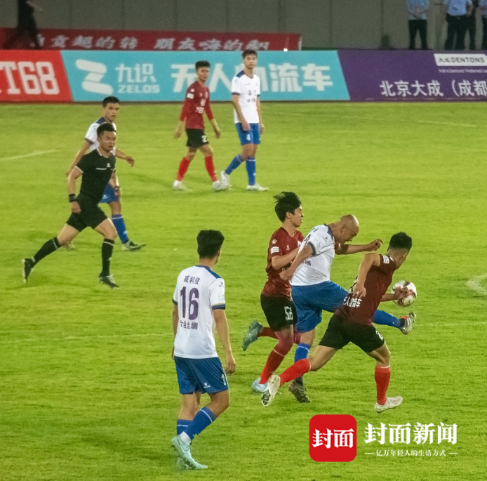 临近终场前1分钟,更让人匪夷所思的画面出现了:自贡队56号球员张乐涛在南充队禁区前奋力拼抢,闪转腾挪间,硬是在4、5名南充队员夹防中杀出一条“血路”,连过4人,在第5名防守扑到前,一脚撩射,皮球直入网窝,在裁判读秒阶段,彻底“杀死”比赛!