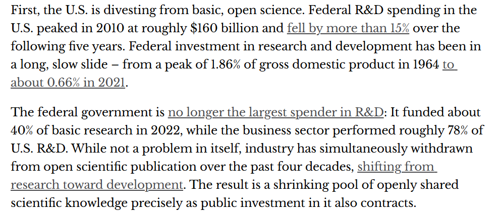 其一,美国对基础科学和开放科学的投入下降。美国联邦研发支出曾在2010年达到约1600亿美元峰值,此后五年下降超过15%;从更长周期看,联邦研发投入占美国国内生产总值的比重,已从1964年的1.86%降至2021年的约0.66%。