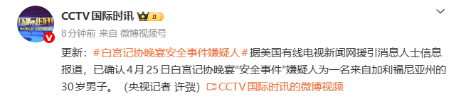 据美国有线电视新闻网援引消息人士信息报道,已确认4月25日白宫记协晚宴“安全事件”嫌疑人为一名来自加利福尼亚州的30岁男子。