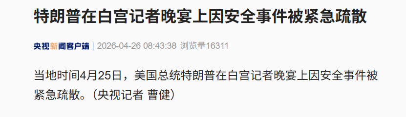 当地时间4月25日,美国总统特朗普在白宫记者晚宴上因安全事件被紧急疏散。