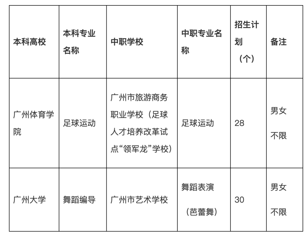 这两个项目参照普通高中特长生模式进行招生,今年共有58个招生计划,包括:广州市旅游商务职业学校(足球人才培养改革试点“领军龙”学校)的足球运动专业,招28人,对口本科高校及专业为广州体育学院的足球运动专业;广州市艺术学校的舞蹈表演(芭蕾舞)专业,招30人,对口本科高校及专业为广州大学的舞蹈编导专业。两个专业的招生均不限男女。