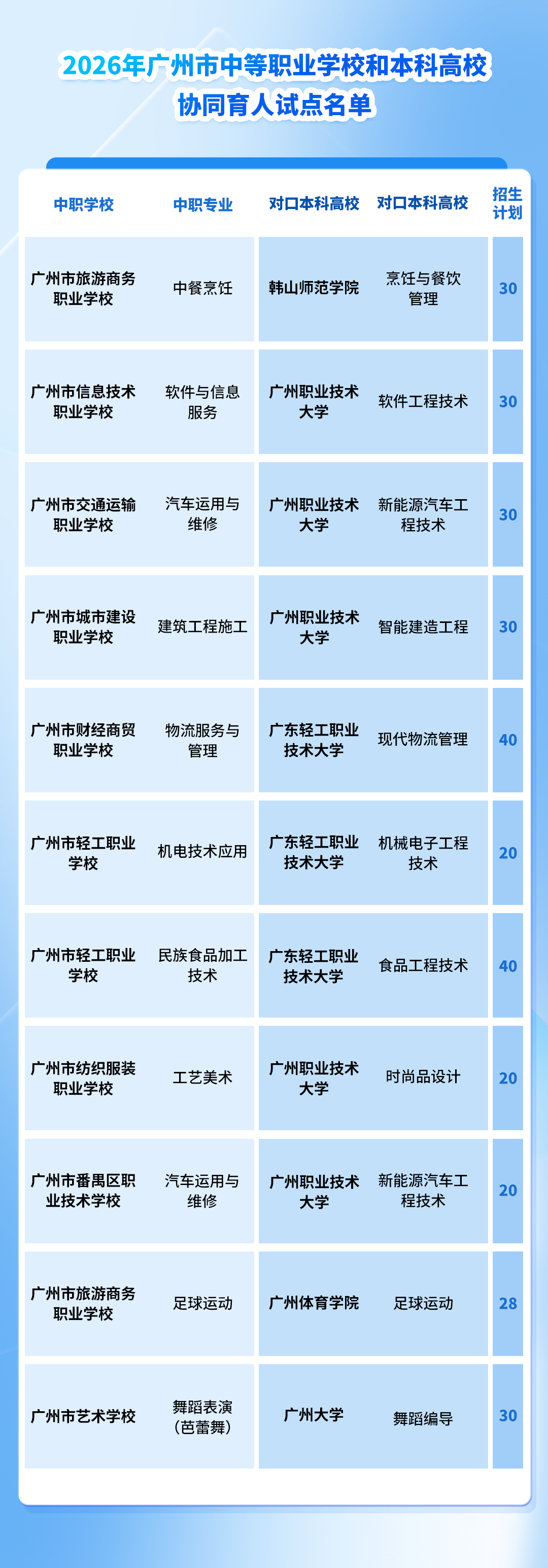 例如,广州市信息技术职业学校的软件与信息服务专业,招30人,对口本科高校和专业为广州职业技术大学的软件工程技术专业。广州市交通运输职业学校的汽车运用与维修专业,招30人,对口本科高校和专业为广州职业技术大学的新能源汽车工程技术专业。广州市番禺区职业技术学校的汽车运用与维修专业,招20人,同样对接广职大的新能源汽车工程技术专业。