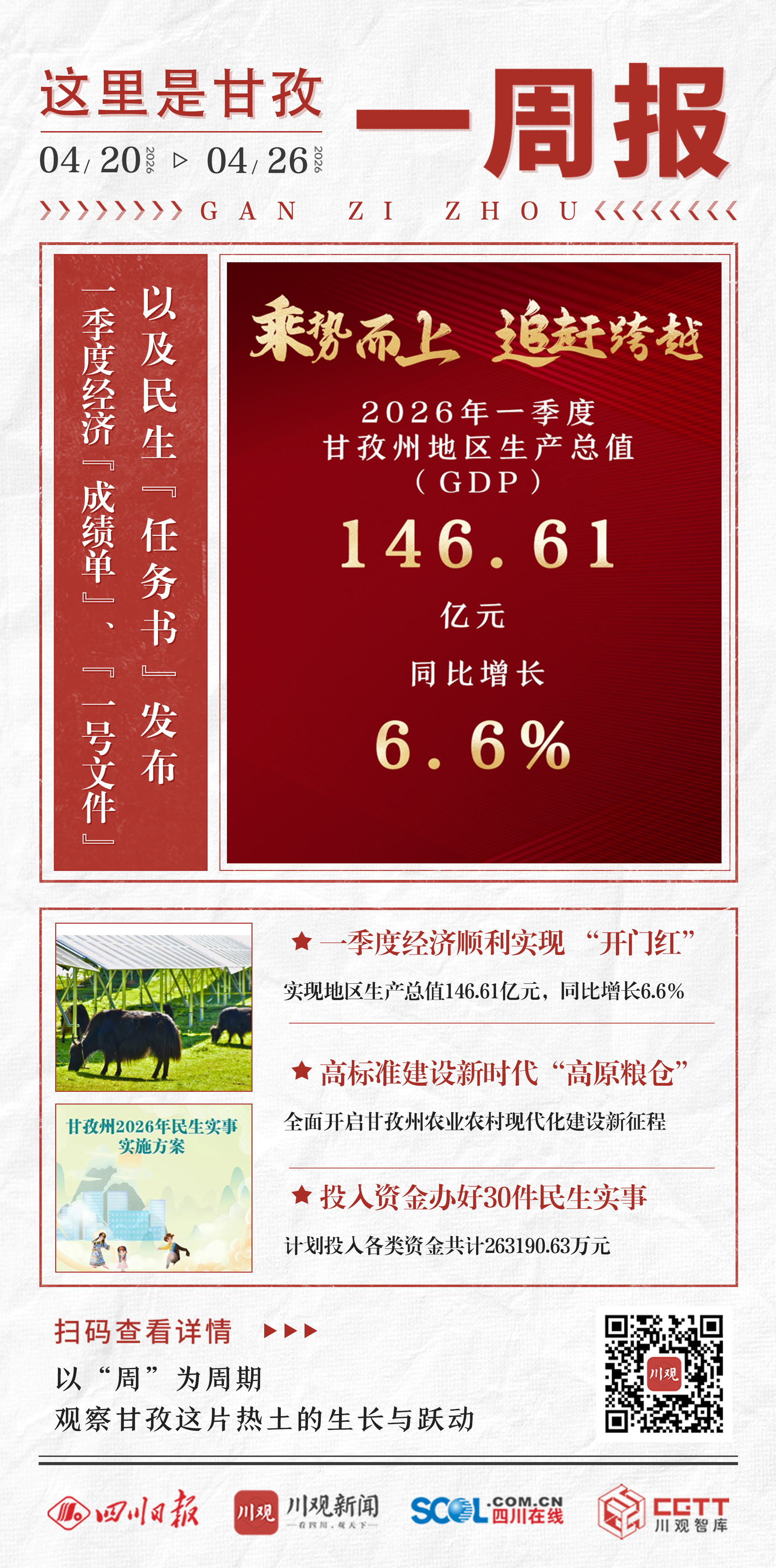 本周(4月20日至26日),甘孜州接连发布一系列政策干货和经济指标干货。在21日周二甘孜州人民政府新闻办公室举行的2026年一季度经济形势新闻发布会上,甘孜州多项指标居全省前列,交出了一份分量十足的经济答卷。