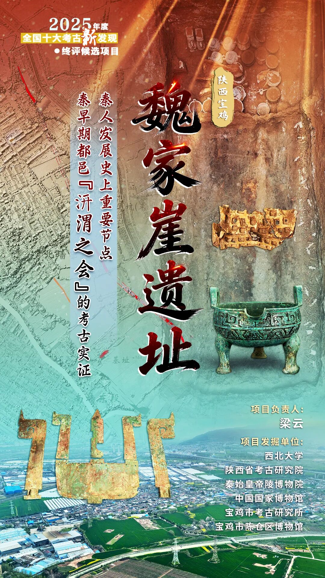 魏家崖遗址位于陕西省宝鸡市陈仓区千河镇魏家崖村,千(汧)河与渭河交汇处的东夹角,总面积约100万平方米,所含遗存以春秋时期秦文化为主。20世纪80年代在该遗址曾发现小型编钟、金虎、金玉铺首。2008年在遗址暴露的灰坑中采集到春秋早期鬲足、筒瓦、陶范。2014年抢救性清理一座铜礼器墓。为了寻找“汧渭之会”所在遗址,2022-2025年西北大学联合陕西省考古研究院、秦始皇帝陵博物院、中国国家博物馆、宝鸡市考古所、陈仓区博物馆,对遗址进行系统发掘,发掘总面积约2700平方米。发掘到龙山、两周、汉代遗存。