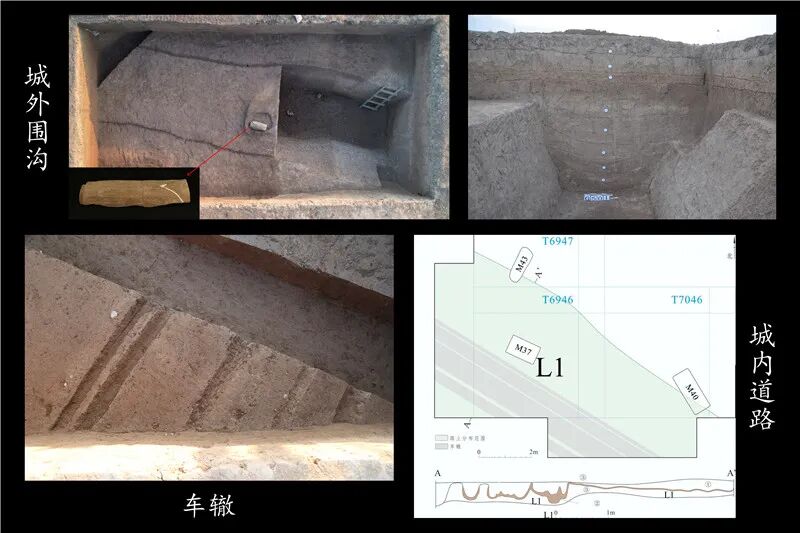 在城内中部发现L1、L2两条并行道路,走向与南、北城墙平行。L1残长124、宽7.5米,踩踏层上有多道车辙。L2应为城内主干道,有东、西两段,残长150、170米,残宽3-6米,厚30-70厘米,包括下部路基和上部踩踏层。