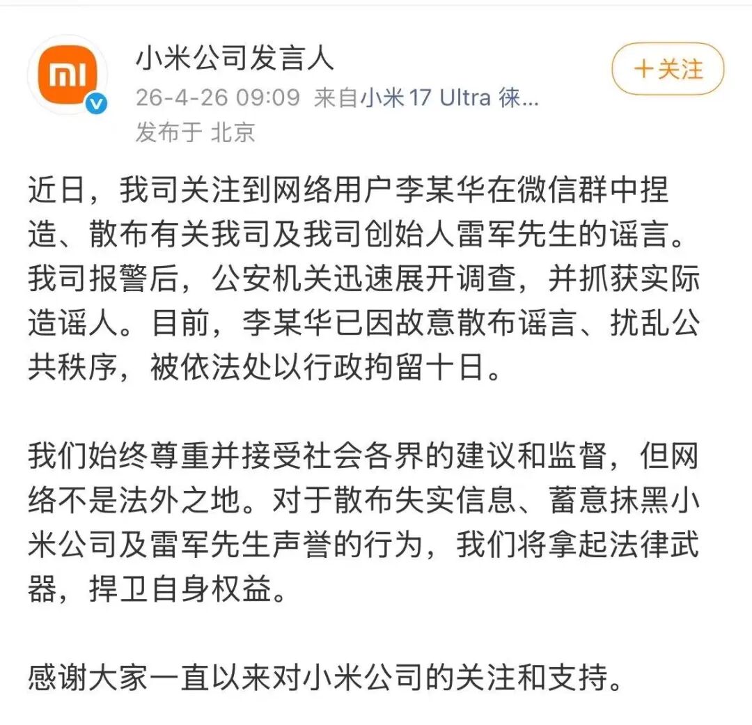 近日,我司关注到网络用户李某华在微信群中捏造、散布有关我司及我司创始人雷军先生的谣言。我司报警后,公安机关迅速展开调查,并抓获实际造谣人。目前,李某华已因故意散布谣言、扰乱公共秩序,被依法处以行政拘留十日。