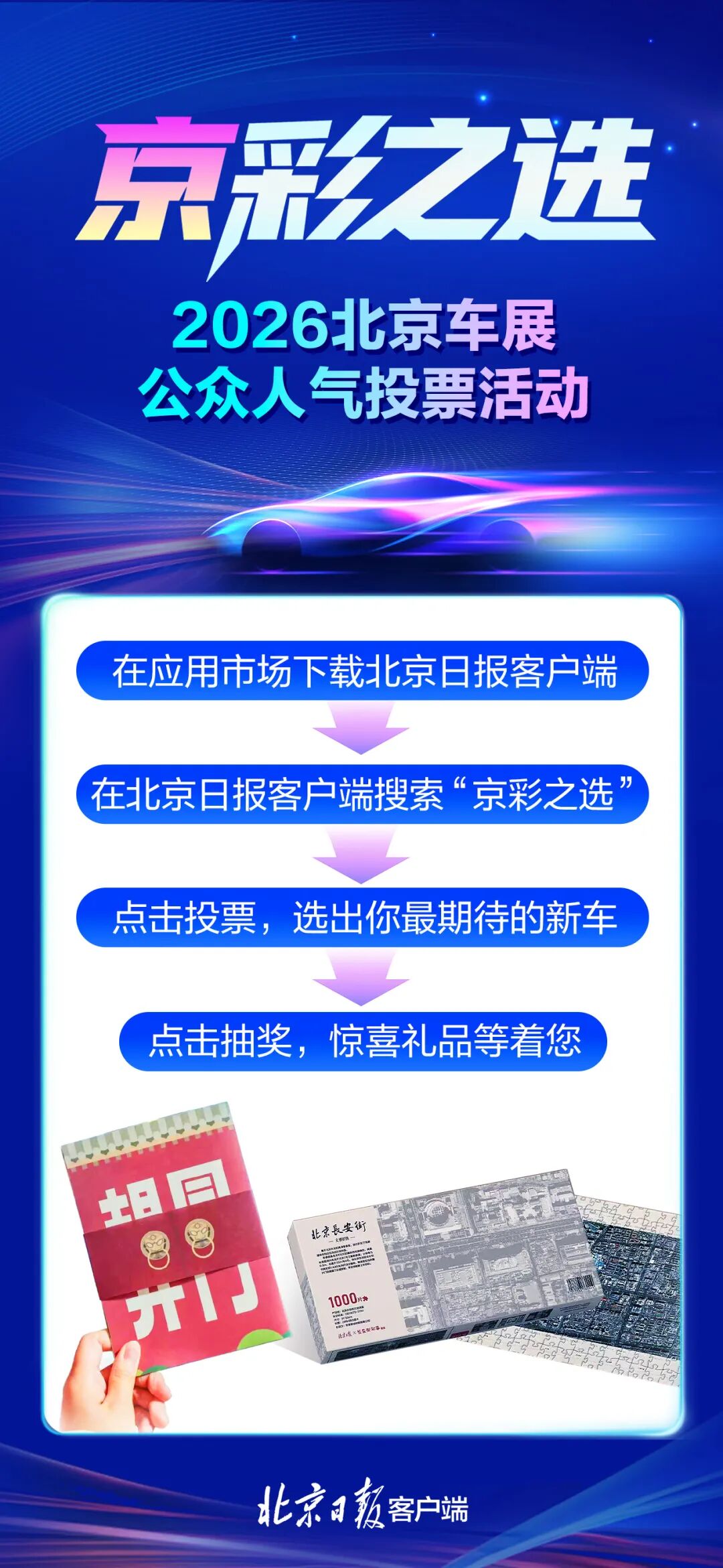 2026北京车展公众人气投票活动来了!即日起,公众可通过下载并登录北京日报客户端,搜索“京彩之选”,为您最期待的新车投出宝贵一票。还有惊喜礼品等着您!