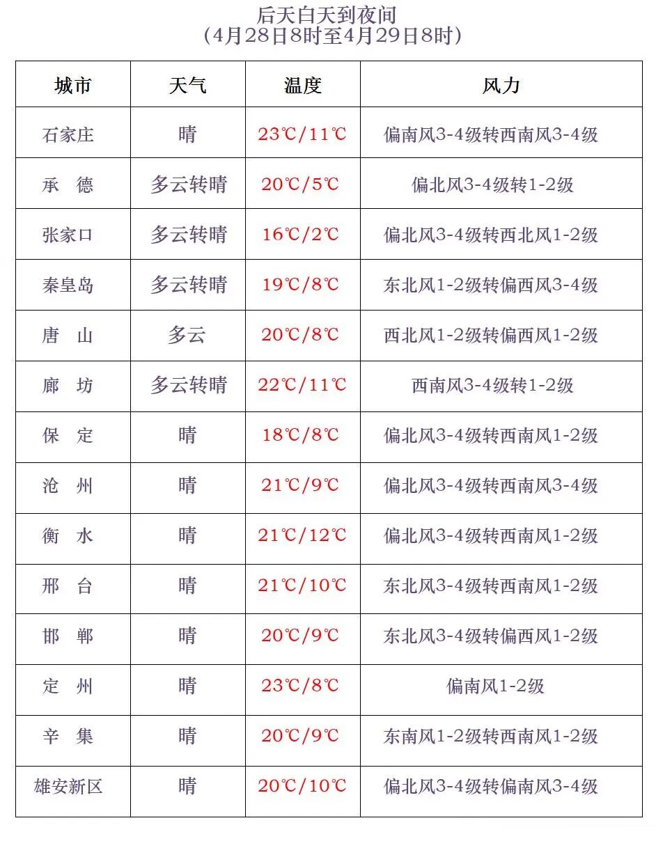 28日白天,张家口、承德西部、保定西北部有偏北风4到5级,阵风6到7级。