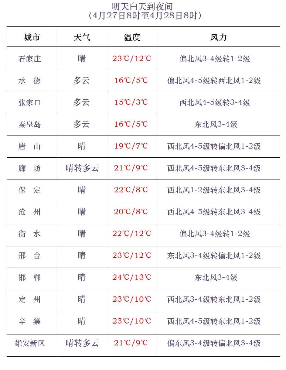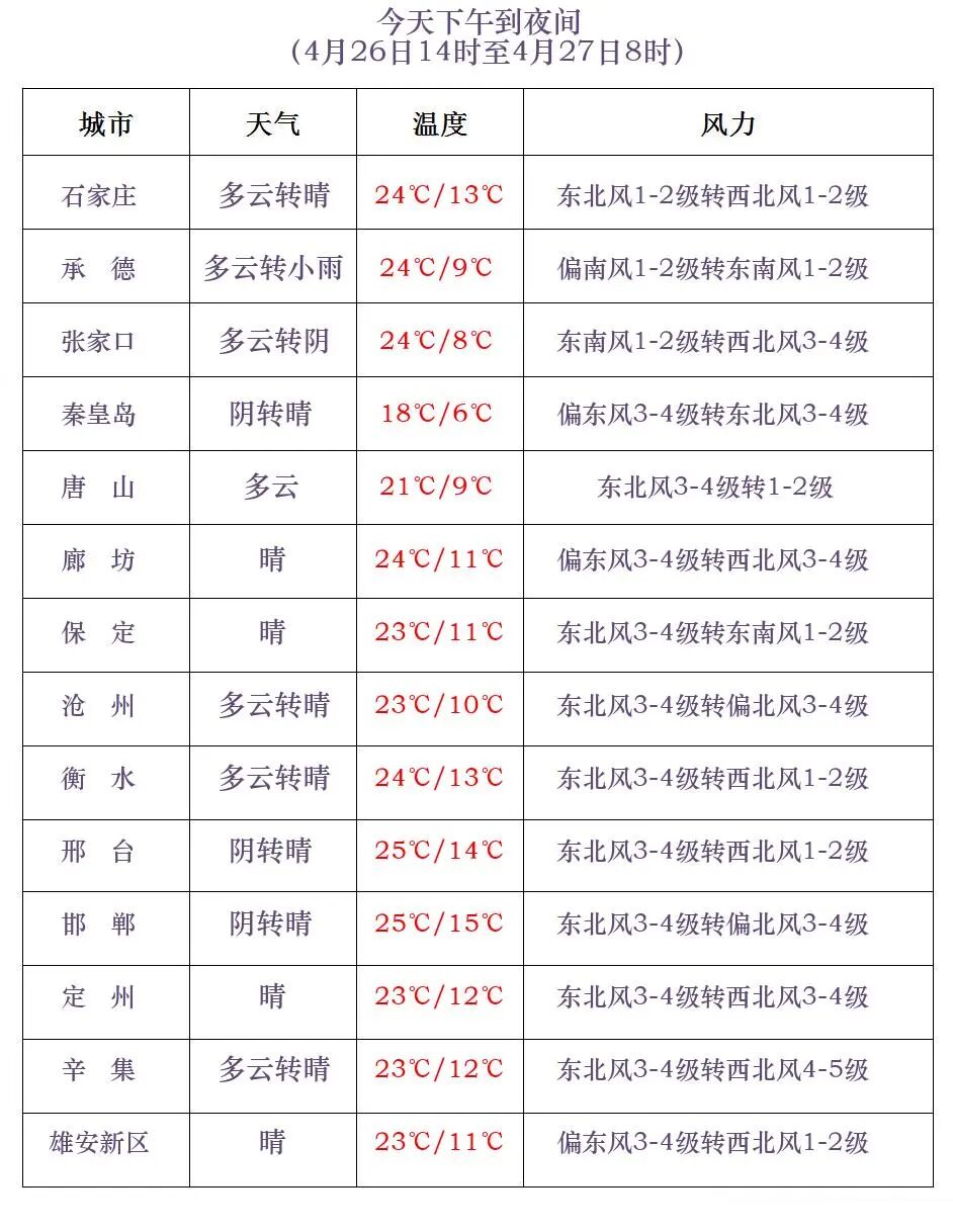 河北省气象台2026年4月26日11时发布天气预报: