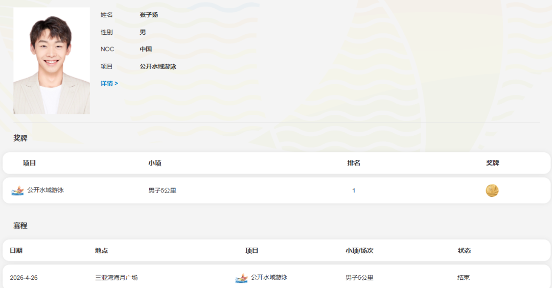 4月26日,第六届亚洲沙滩运动会公开水域游泳男子5公里决赛在三亚湾海月广场附近海域举行,中国选手张子扬斩获金牌!恭喜中国队!