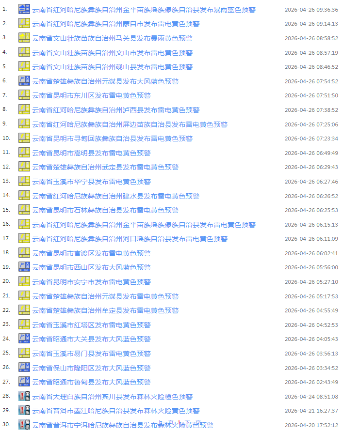 截至发稿时,全省范围内有30个气象预警信号,其中,金平、马关两地分别发布暴雨预警信号。另有19县(市、区)发布雷电黄色预警。