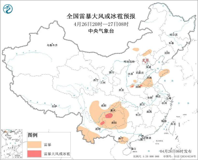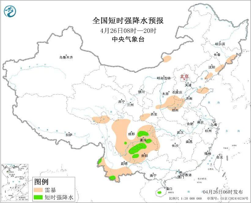 中国天气网今晨发布强对流天气预报,预计4月26日08时至27日08时,河南东部、湖南西部、四川东部、重庆、贵州西部和北部、云南东北部和西南部、广西南部等地的部分地区将有短时强降水天气,小时雨量20-40毫米,局地可达50毫米以上;另外,山西南部、山东西部、河南北部和西部、四川南部、重庆西部、贵州西部、云南东北部等地的局地将有雷暴大风或冰雹天气。