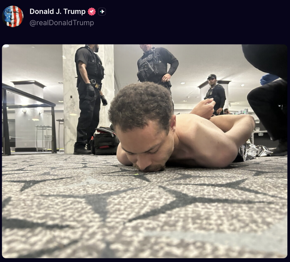 美国总统特朗普在“真实社交”上发布了一张照片,照片显示一名男子躺在华盛顿希尔顿酒店的地上。该男子似乎是嫌疑人。他还发布了一段监控录像,录像显示一名男子跑过华盛顿希尔顿酒店的安检点。视频中,安检人员拔枪并疑似射击。特朗普在随后举行的发布会上表示,他公布监控录像是为了“提高透明度”,并展示安保人员对枪手的反应速度。